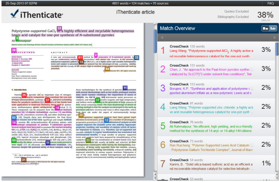ابزارهای تشخیص سرقت ادبی معمولاً توسط مجلات دانشگاهی مورد استفاده قرار می گیرد تا از خود و جامعه دانشگاهی در برابر انتشار متن سرقت ادبی محافظت کند. یکی از ابزارهایی که بیشتر مورد استفاده قرار می گیرد iThenticate است. به طور کلی، iThenticate یک سند را با پایگاه داده اختصاصی CrossRef مقایسه می کند، که شامل تعداد زیادی اسناد کنفرانس ها، مجلات و کتاب های علمی است. این ابزار همچنین جستجوی اینترنتس و پایگاه های داده چندین ارائه دهنده محتوای دیگر را انجام می دهد. سپس برنامه یک شاخص شباهت ایجاد می کند. به طور کلی، نمره شباهت برای ارزیابی گیری میزان مشابه بودن یک سند با متن منتشر شده قبلی بکار می رود. خروجی اصلی سیستم iThenticate بصورت زیر خواهد بود.