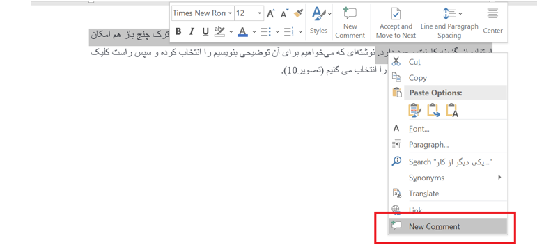 یکی دیگر از کاربردهای ترک چنج اضافه کردن توضیحات است. البته در صورت غیرفعال بودن ترک چنج باز هم امکان استفاده از گزینه کامنت وجود دارد. نوشتهای که میخواهیم برای آن توضیحی بنویسیم را انتخاب کرده و سپس راست کلیک کنیم و گزینه new comment را انتخاب می کنیم (تصویر10).