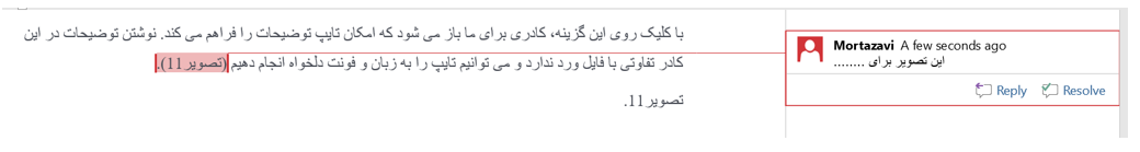 با کلیک روی این گزینه، کادری برای ما باز می شود که امکان تایپ توضیحات را فراهم می کند. نوشتن توضیحات در این کادر تفاوتی با فایل ورد ندارد و می توانیم تایپ را به زبان و فونت دلخواه انجام دهیم (تصویر11).