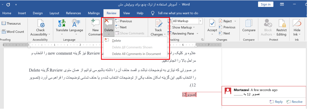 در صورتی که نیازی به توضیحات نباشد و قصد حذف آن را داشته باشیم می توانیم از همان منوی Review گزینه Delete را انتخاب کنیم. این گزینه امکان حذف یکی از توضیحات انتخاب شده و یا حذف تمامی توضیحات را فراهم می آورد (تصویر 12).