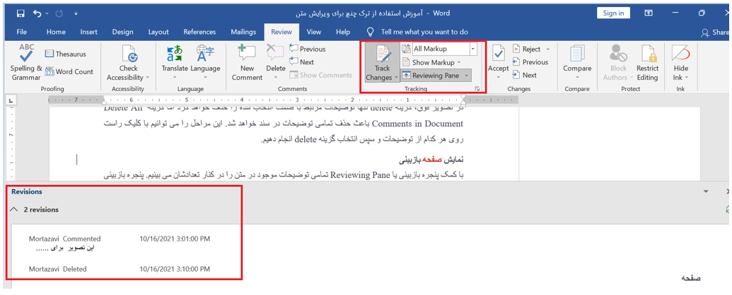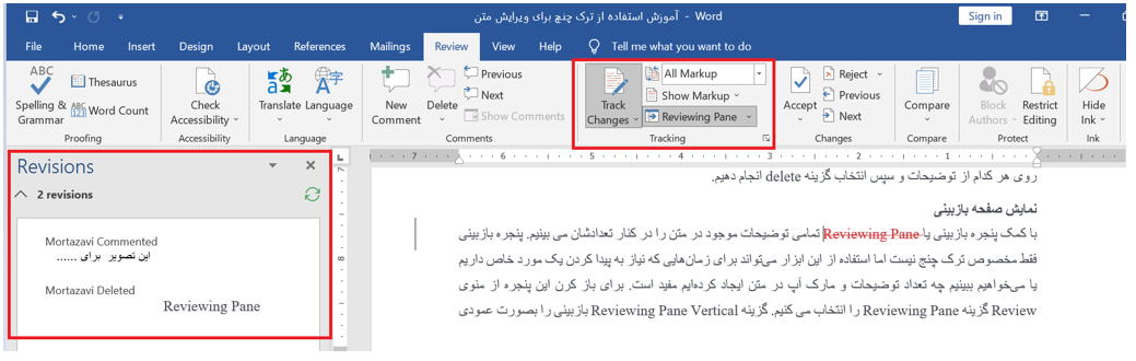 با کمک پنجره بازبینی یا Reviewing Pane تمامی توضیحات موجود در متن را در کنار تعدادشان می بینیم. پنجره بازبینی فقط مخصوص ترک چنج نیست اما استفاده از این ابزار میتواند برای زمانهایی که نیاز به پیدا کردن یک مورد خاص داریم یا میخواهیم ببینیم چه تعداد توضیحات و مارک آپ در متن ایجاد کردهایم مفید است. برای باز کرن این پنجره از منوی Review گزینه Reviewing Pane را انتخاب می کنیم. گزینه Reviewing Pane Vertical بازبینی را بصورت عمودی در سمت چپ صفحه و گزینه Reviewing Pane Horizontal بازبینی را بصورت افقی در پایین صفحه نشان می دهد (تصویر 13 و 14).
