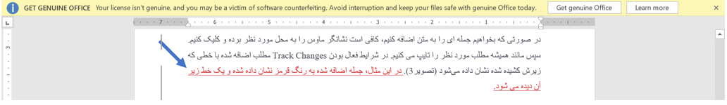 در صورتی که بخواهیم جمله ای را به متن اضافه کنیم، کافی است نشانگر ماوس را به محل مورد نظر برده و کلیک کنیم. سپس مانند همیشه مطلب مورد نظر را تایپ می کنیم. در شرایط فعال بودن Track Changes مطلب اضافه شده با خطی که زیرش کشیده شده نشان داده میشود (تصویر3).