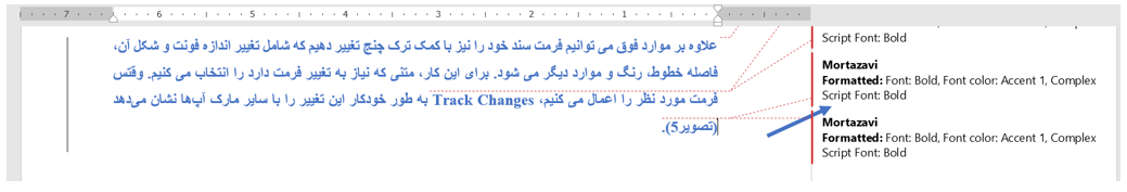 علاوه بر موارد فوق می توانیم فرمت سند خود را نیز با کمک ترک چنج تغییر دهیم که شامل تغییر اندازه فونت و شکل آن، فاصله خطوط، رنگ و موارد دیگر می شود. برای این کار، متنی که نیاز به تغییر فرمت دارد را انتخاب می کنیم. وقتس فرمت مورد نظر را اعمال می کنیم، Track Changes به طور خودکار این تغییر را با سایر مارک آپها نشان میدهد (تصویر5).
