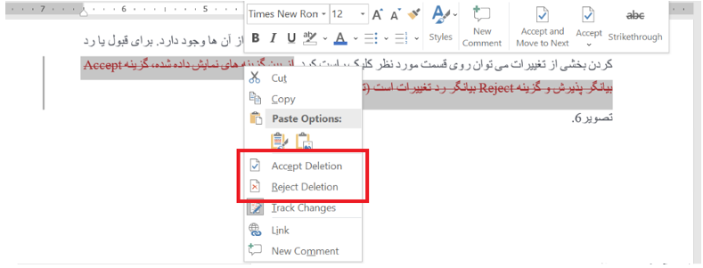 پس از اعمال تمامی تغییرات مورد نظر، امکان قبول یا رد تمامی تغییرات و یا بخشی از آن ها وجود دارد. برای قبول یا رد کردن بخشی از تغییرات می توان روی قسمت مورد نظر کلیک راست کرد. از بین گزینه های نمایش داده شده، گزینه Accept بیانگر پذیرش و گزینه Reject بیانگر رد تغییرات است (تصویر6).